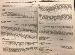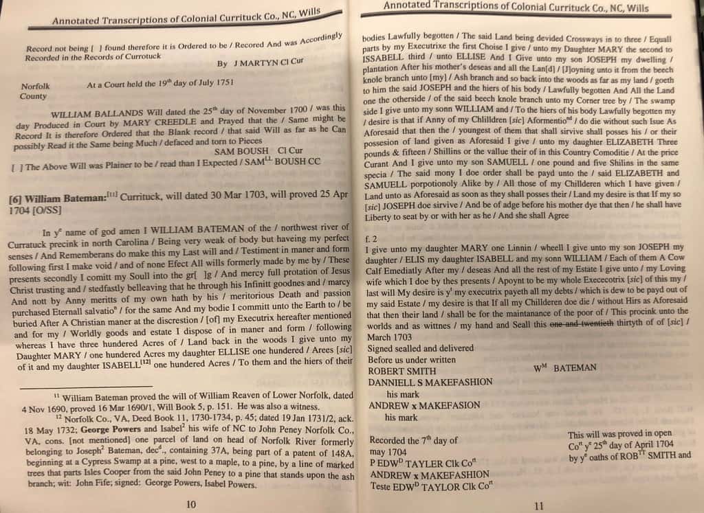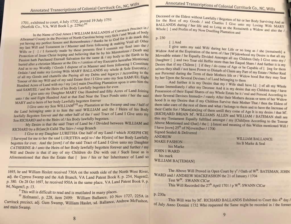 In the Name of God Amen I William Ballands of Currituck Precinct in Albramarl County in the Province of North Carolina being very Sick/and Weak of body yet having my perfect Sences and Remembrance / thanks be to God for it do maek this my last Will and Testament in / Manner and form following & making Void all Other Wills or [ ] / I formerly made by these presents first I commit my Soul into the Protection of Jesus Christ hoping and believing that he by his Meretorious / Death and Passion hath Purchased Eternall Salvation for the same & / my body to the Earth to be buried after a christian Manner at the Dis = / cretion of m Executrix hereafter Mentioned And as to my Worldly / Goods / dispose of in Manner and form following I Constitute Ordain/ and make my Loving Wife Mary Ballands my whole & Sole Executrix / of all my Goods and chattells she Paying all my Debts and legacys According to the Tenour of this my Will and of my said Estate first / I Give unto my Son Samuel, Eight Hundred Acres of Land with my / my [sic] main Dwelling Plantation upon it unto him the said SAMUEL / and the Heirs of his Body Lawfully begotten for ever.