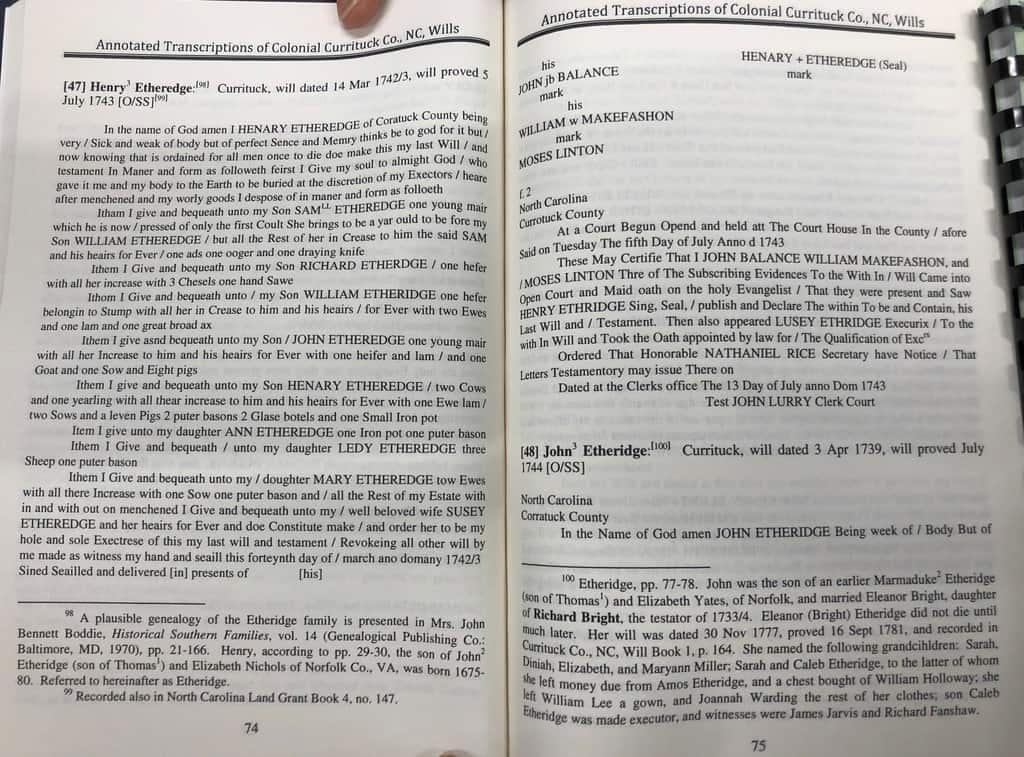 page 75-77 John Etheridge: Currituck, will dated 3 Apr 1739, will proved July 1744