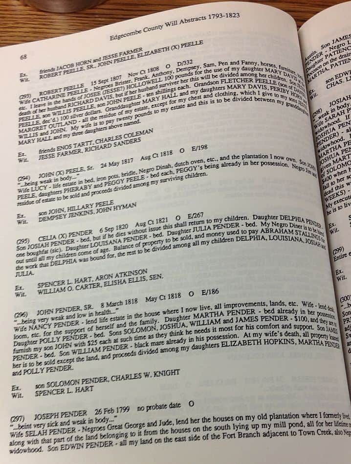 (293) Robert Peele 15 Sept 1807 Nov Ct 1808 O D/332 Wife Catharine Peele – Negroes Brister, Frank, Anthony, Dempsey, Sam, Pen and Fanny, horses, furniture, tools, etc. I leave in the hands of Josee(Jesse?) Hollowell 100 pounds for the use of my daughter Mary Davis at the death of her husband Richard Davis, but if her husband surviver her this will be divided among her children, son JessePeelle, son Willis Peelle, son John Peele – ten shillings each. Grandson Fletcher Peelle (son of Daniel Peelle, dec’d) 100 silver dollars. Granddaughter Mary Hall and my daughters Mary Davis, Feriby Horn and Margaret Outland – all the residue of my estate, except for my chest and clothing, which I give to my sons Jesse, Willis and John. My wife is to pay twenty pounds to my estate and this is to be divded between my granddaughters Mary Hall and my three daughters above named. Ex. friends Enos Tartt, Charles Coleman Wit. Jesse Farmer, Richard Sanders