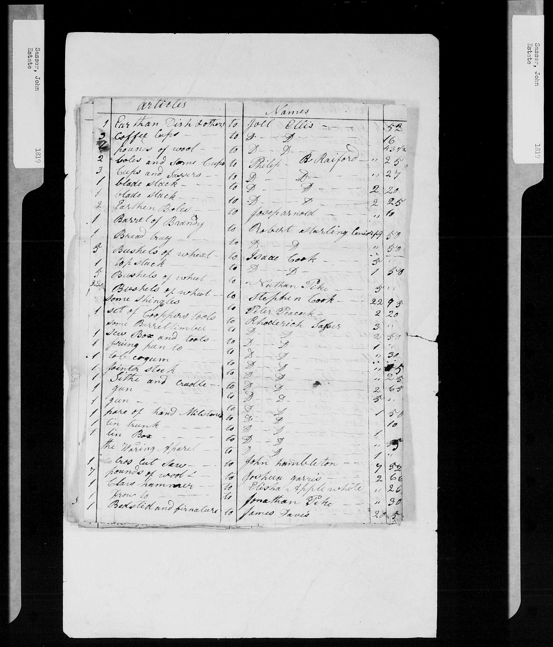 p43 – 1808 -State of North Carolina Wayne County Agreeable to an Order ipaid for the county Court of Wayne to us Directed loe have proceeded to lay off all of to Mrs Sasser widow of James Saser died the following are teler & provisions for her and her familys support for one year to toet 2000lbs of Pork bq bbles born 75 lb of sugar two mack of blace fodder 15 Bushels of wheat one bushel plase suede 6 bushels oats 8 bushels of peas 7 potate plantains 3 bushels salt 10 lbs coffee 1 lb tea and 5 lbs shorn cotton All which is submitted March 8th 1808 In o C Pinder E Stocumb P Collier Sampson Lane