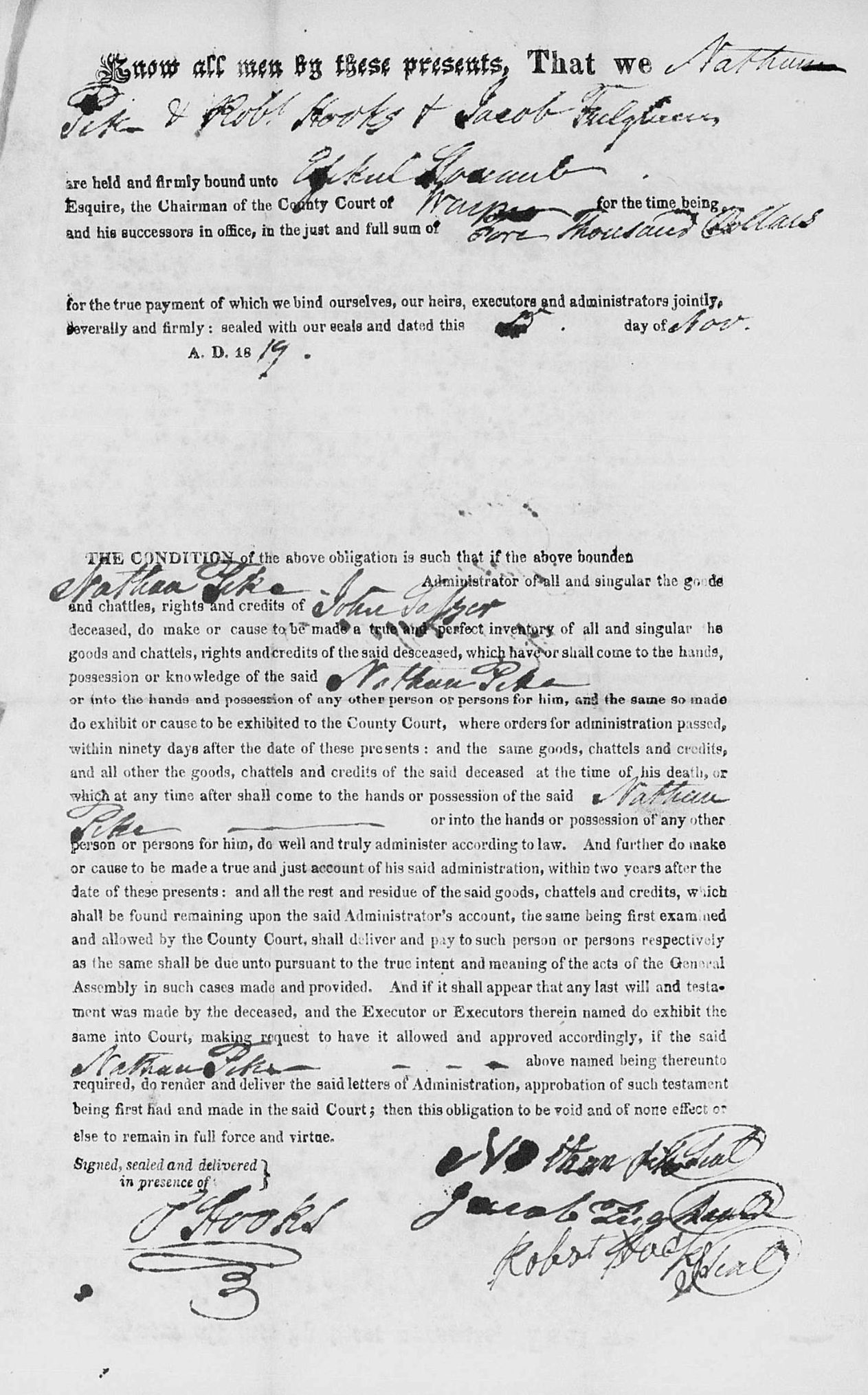 The condition of the above obligation is such, that if the above bounden William H. Buckler administrator of all and singular the goods and chattels, rights and credits of Smith Sparrow deceased, do make, or cause to be made, a true and perfect inventory, and account of sales, of all and singular the goods and chattels, rights and credits of the said deceased, which have or shall come to the hands, possession or knowledge of him the said William H. Buckler or into the hands or possession of any other person or persons, for him, and the same so made do exhibit, or cause to be exhibited, into the office of the Court of Pleas and Quarter Sessions of the County aforesaid, within ninety days after the date of these presents, and the same goods, chattels, and credits, and all other the goods, chattels and credits of the said deceased at the time of his death, or which at anytime after shall come to the hands or possession of the said William H. Buckler or into the hands or possession of any other person or persons, for him, do well and truly administer according to law; and further, do make, or cause to be made, a true and just account of his said Administration, within two years after the date of these presents, and all the rest and residue of the said good, chattels and credits, which shall be found remaining upon the said administrator’s account the same being first examined and allowed of by the Court of said County, shall deliver and pay unto such person or persons, respectively, as the same shall be due unto, pursuant to the true intent and meaning of the Act in that case made and provided; and if is shall appear that any last will and testament was made by the said deceased, and the Executor or Executors therein named to exhibit the same into Court, making request to have it allowed and approved accordingly: if the said William H. Buckler above bound, being thereunto required, do render and deliver the said letters of administration, (Probate of such testament being first had and made in the said court,) then this obligation to be void and of no effect, or else to remain in full force and virtue.