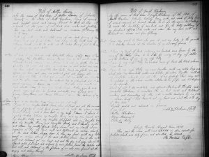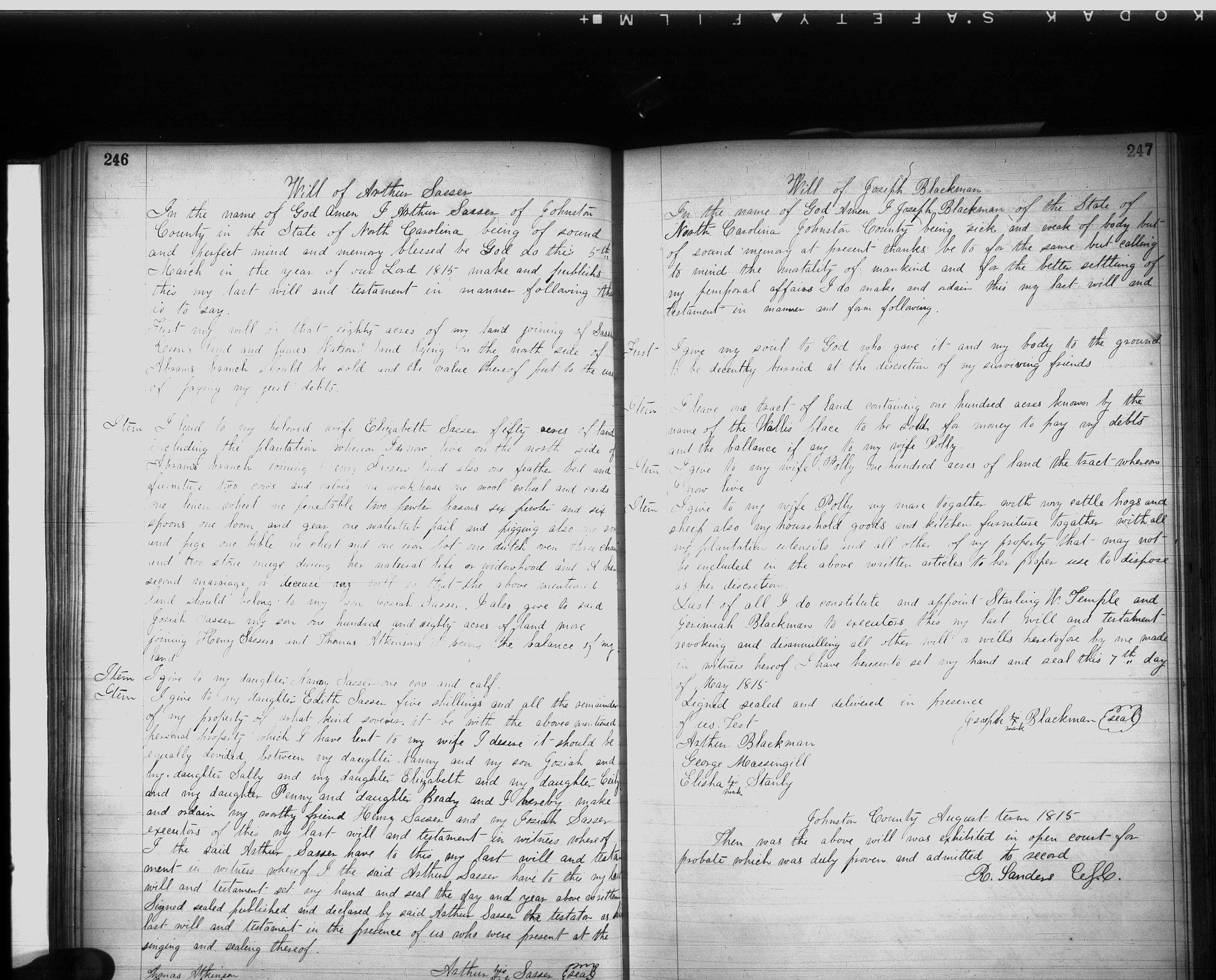 I Edith Sasser of Johnston County and State of North Carolina being very sick and weak in body but of sound and perfect mind and memory blessed be God do this 14th day of July in the year of our Lord 1816 . make and publish this my last Will and Testament in manner following that is to say , after paying my Just debts I give to my sister Nanny Sasses one shilling Item , I give to my sister Sally Sasser one shilling Sam . I give to my brother Josiah Sasser one shilling Item , I give to my sister Elizabeth Safer one Shilling Item , I give to my sister Sally Sale one shelling Item , I give to my sister Penny Sasser one shilling Item . I give to my sister Brady Sasser one shilling and all the residue remainder of my property or Estate of whatsoever kind it be I give to my chosen Liledy Sasser – And I hereby make and ordain my worthy friends Henry Sasser and Joseph Bozell Executors of this my last Will and Testament in witness whereof I the said Edith Soper Super have to this my last Will held Testament set my hand and seal the day and year above written Signed , sealed , published and declared by the said Edith after the Testator as her last Will and Testament in the presence of us who were present at the time of signing & sealing thereof Thomas Kirby Charles Kirby Edith Sasser Mariah Rose Johnston County August Term 1816 Then was the above Will Exhibited in open Court for probate which was duly procean of admitted Recorded Sander all An Inventory of the Estate of Henry Powell decd taken this first day of March 1816 1 Salt Marter ┃ Note against Jonathan Britt 7 Chairs for $ 7175 – 2 Bridle bill ┃ Note against Redden Johnson 2 tea spoons Cup & Ivan piece of Looking caps 2 axes for $ 17.37 2 Notes against Cader Farmer one for $ 16 the other $ 26 10 dollars in Cash Note against Allen Collins Stock lock for for $ 1.35 cts in Box note against N W Bryan for $ 11 . 2 Horses of Saddles Writing Desk purter plates ough has traces forks Small or dollars cash but to John Farmer by order of Cader Farrer — Note against W Bryan for $ 17