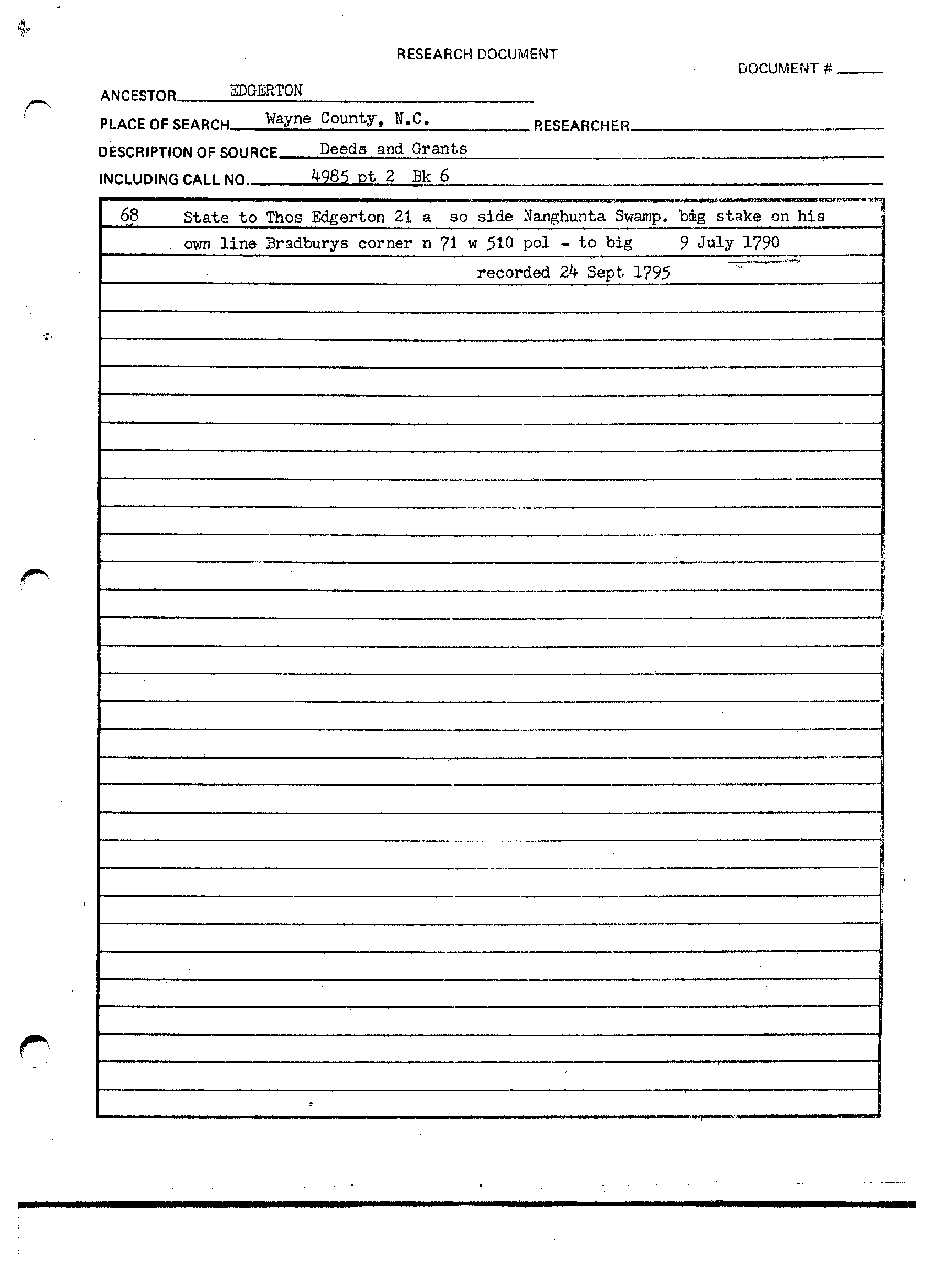 p. 68 State to Thos Edgerton 21 a so side Nanghunta Swamp. big stake on his own line Bradburys corner n 71 2 510 pol – to big
