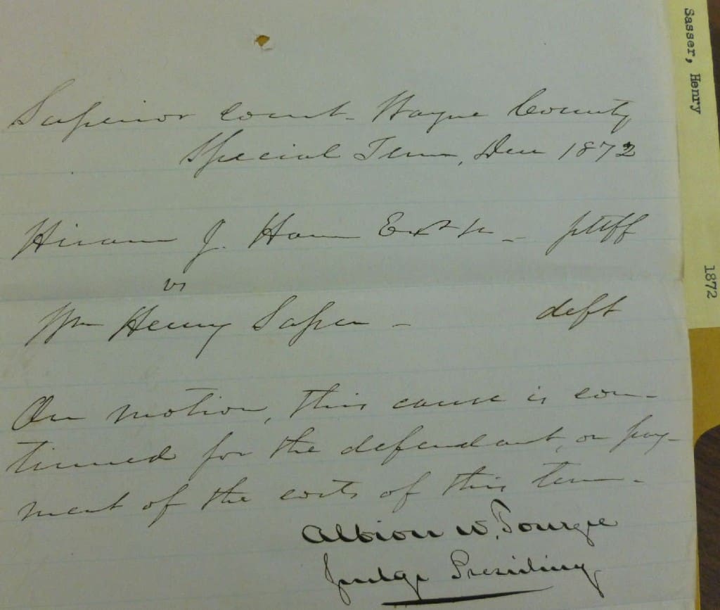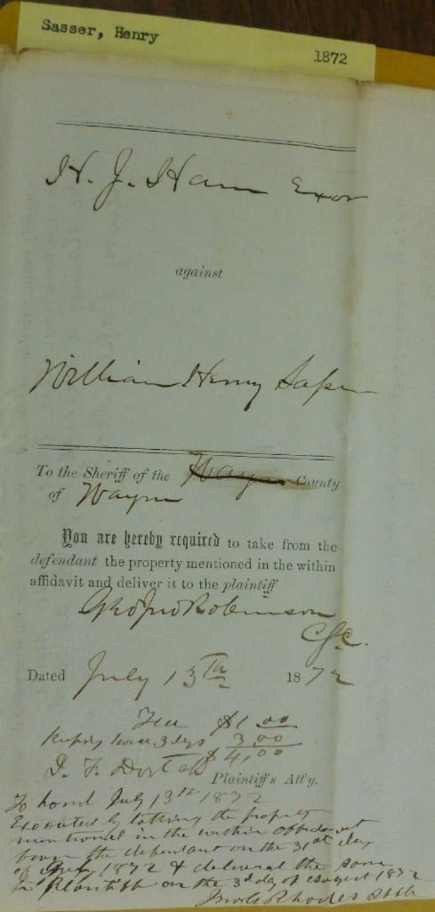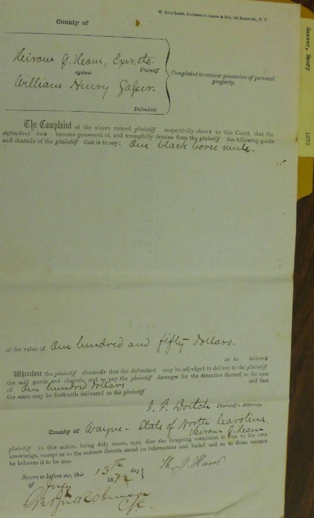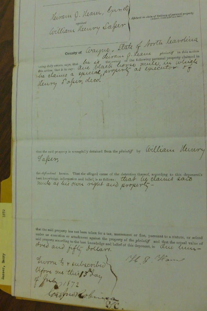 Hiram J. Hearn plaintiff in this action being daly sworn says that he is the owner of the following personal property claimed in this action this is to say: due black horse mule in which he claims a special property – as executor of Henry Saser, decd.