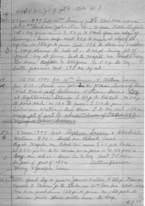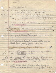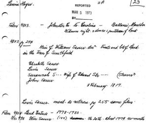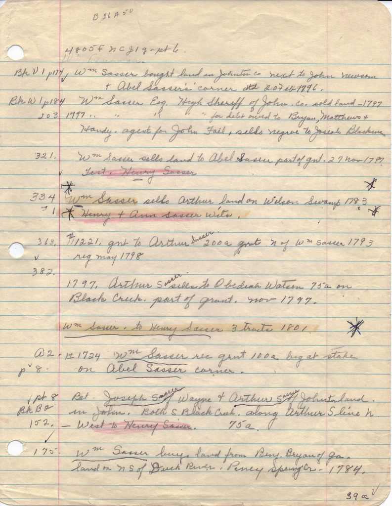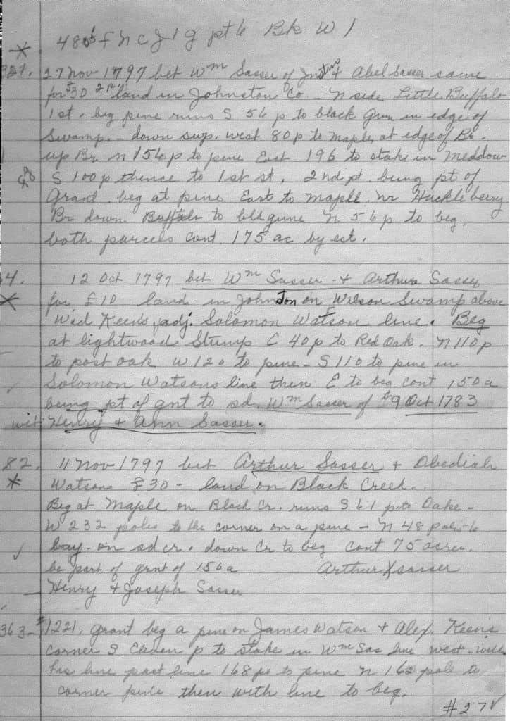 12 Oct 1797 bet Wm Sasser and Arthur Sasser for £10 land in Johnston on Wilson Swamp above Wid Keen’s adj. Solomon Watson line. Beg at lightwood Stump E40p to Red Oak. N110p to post oak W120 to pure S110 to pine in Solomon Watsons line then E to beg cont 150 a being pt of gnt to sd. Wm Sasser of 9 Oct 1783 wit Henry and Ann Sasser.